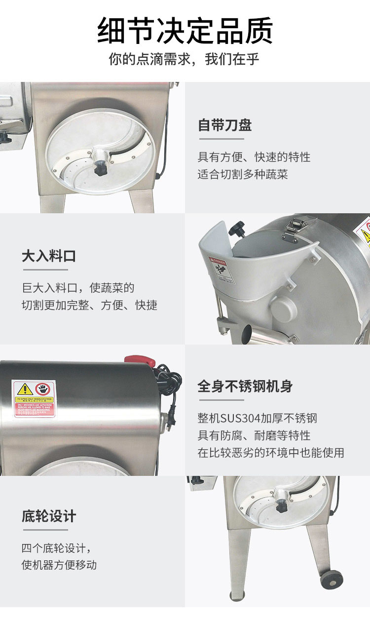 ·多样功能:将根茎类:土豆、萝卜、红薯、笋类、洋葱、 茄子、莴笋、黄瓜等根茎类果蔬 切片、丝、丁,适合卫生餐饮人员或食品加工厂使用。