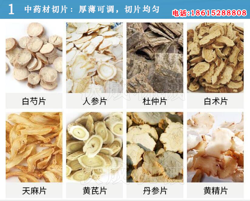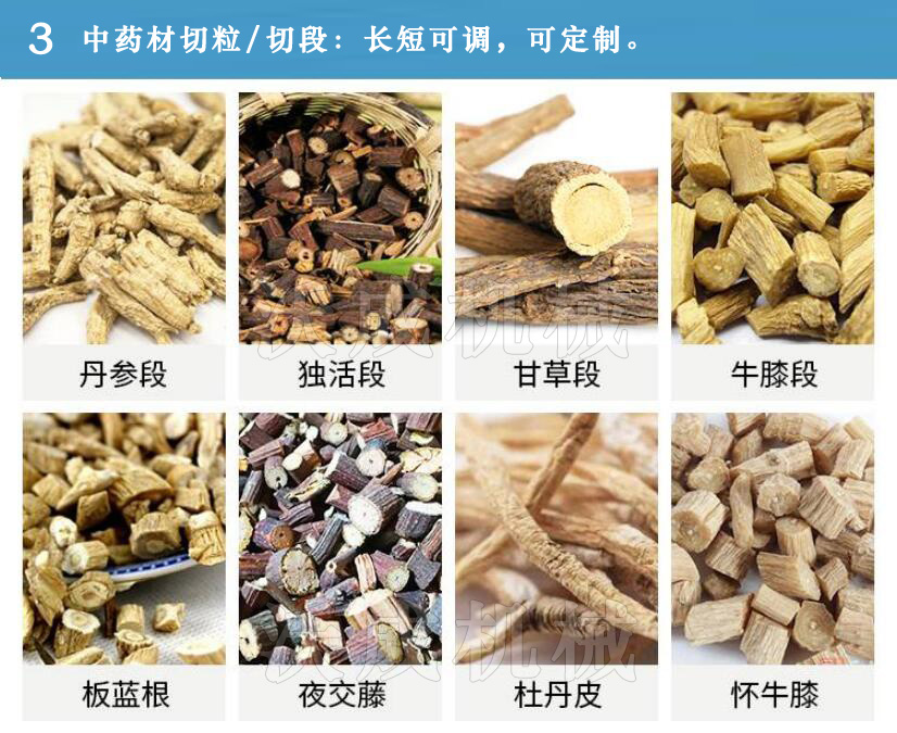 新款滑轨剁刀式切药材机,操作方便简单,节省人工,压料装置可以将中草药材直接输送到刀下。通过切药材专用合金刀片将根茎、皮藤类 干茎叶类等植物或各种中草药材如丹参,党参,虎杖,鸡血藤、木香、白芍、木通,黄柏,桂枝,蒲公英,甘草,当归、天麻、人参、山姜  黄芪、灵芝、陈皮等中药材加工成片、段、丝、粒、条等多种形状。